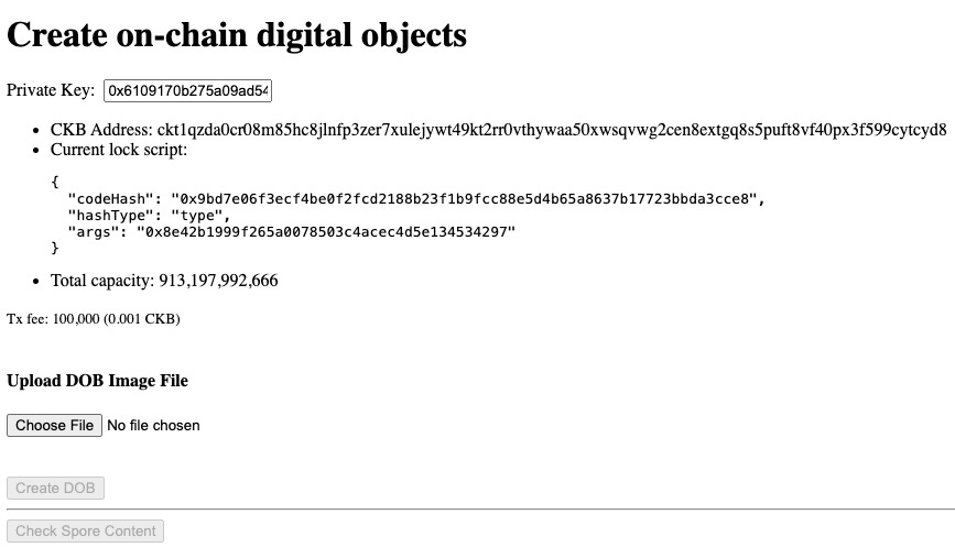 Once we have the picture content and the private key, we will build a transaction that produces a Spore output Cell, aka the digital object Cell. We can handle all the logic with Lumos.js, but with the help of Spore-SDK, it becomes very simple to do: